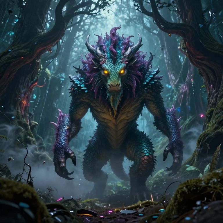 Monsert creature in a dark enchanted forest, glowing eyes, mist swirling around ancient twisted trees, eerie and mysterious atmosphere, detailed texture on fur and scales, fantasy art style with vibrant colors and dynamic lighting