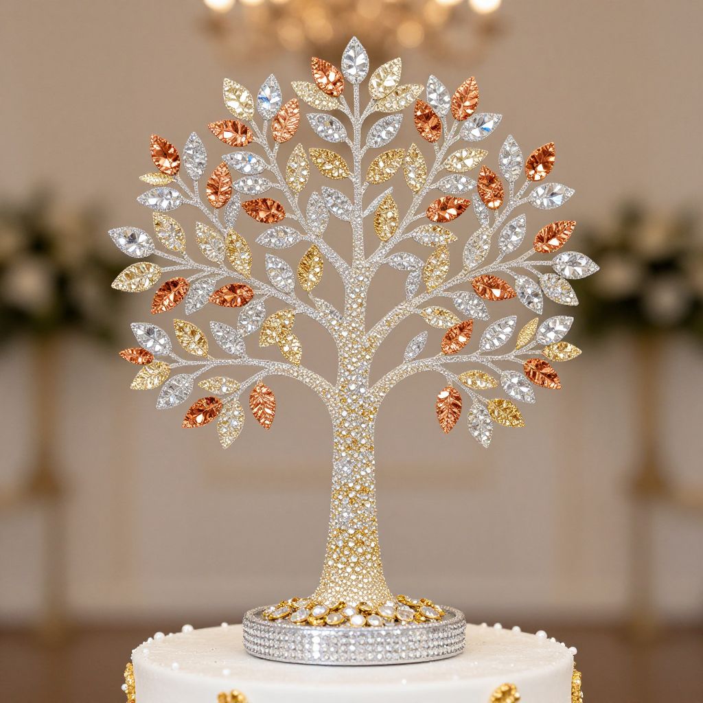 Elegant Mariage custom tree cake topper, crafted with Swarovski crystal elements in silver, copper, and gold, stands gracefully as a centerpiece, featuring intricate branches adorned with shimmering leaves and a sparkling base, perfect for wedding celebrations.
