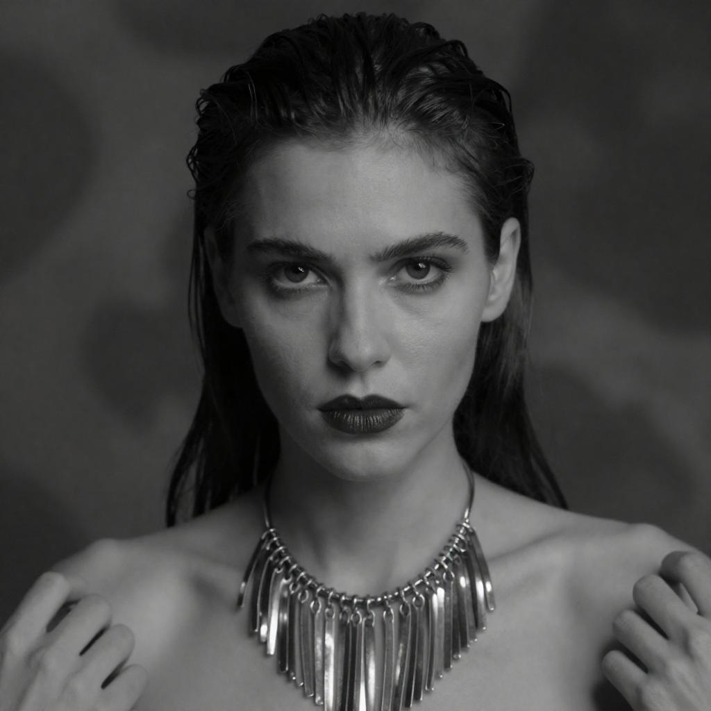Black-and-white photograph of a pale-skinned woman with dark, slicked-back hair and intense, dark eyes. She wears a metallic, fringe-style necklace and dark lipstick. Her expression is serious and focused. The blurred background features indistinct patterns. Her hands are partially visible in the foreground. The image has a high-contrast, dramatic style.