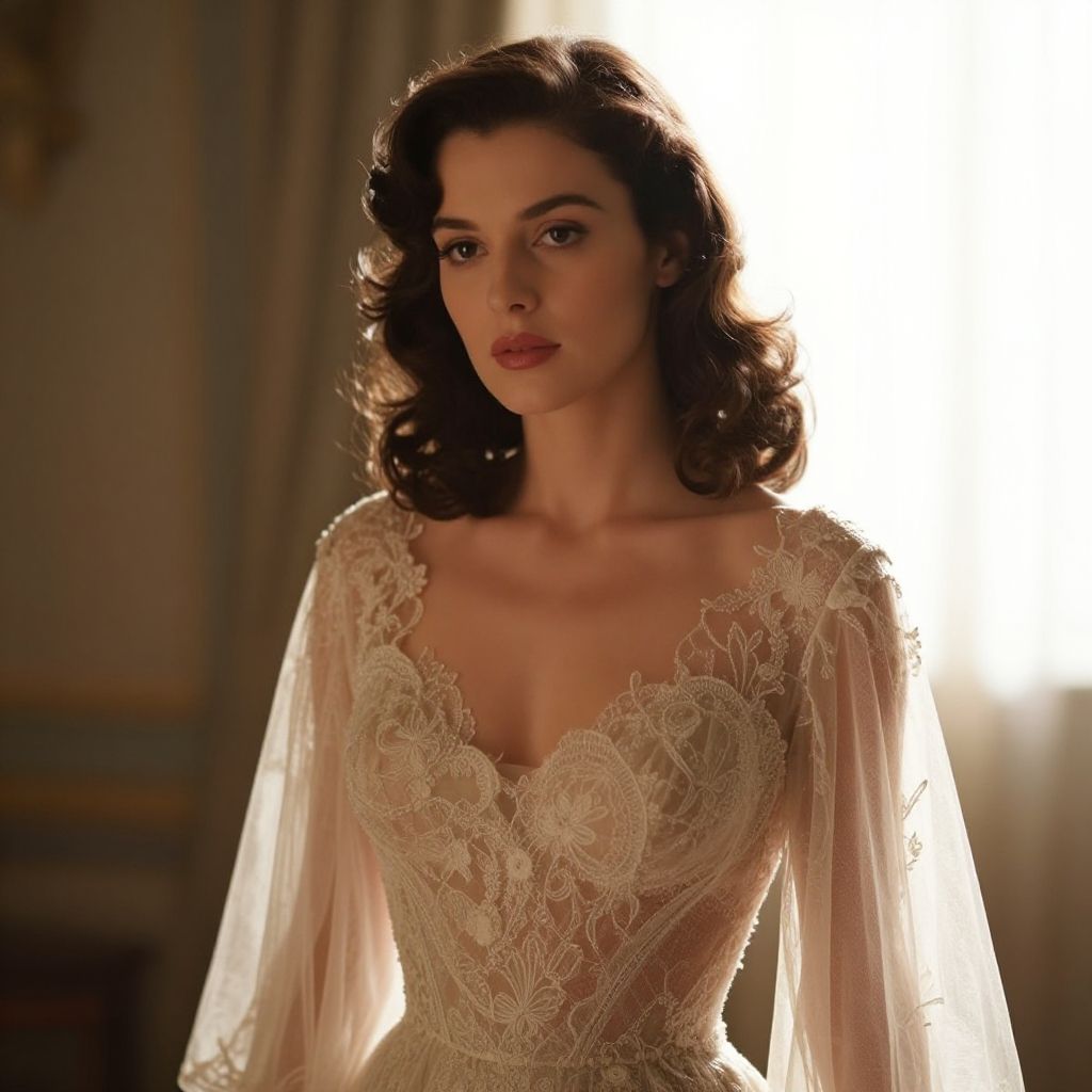 This stunning image features a woman in a beautifully designed, translucent gown with intricate lace detailing. Bathed in soft, natural light that enhances the elegance of her pose, the setting evokes a cinematic atmosphere reminiscent of classic romance films.