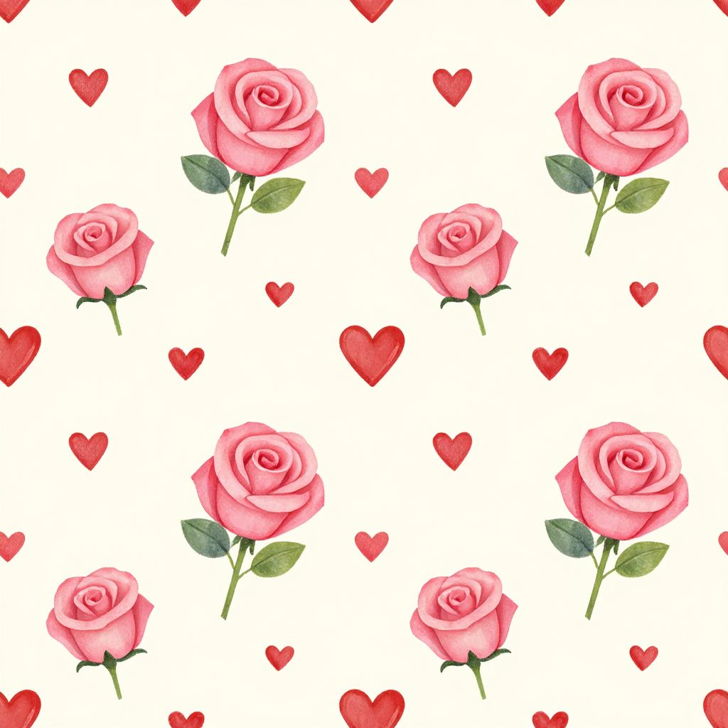 Cute pink roses with detailed petals and green leaves are elegantly arranged in a seamless pattern, interspersed with small red hearts on a soft cream-colored background.
