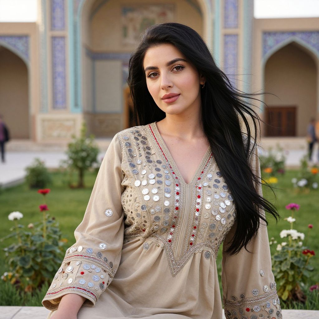 A serene Afghan woman with soft features, fair skin, and long black hair flowing gently, wearing a hand-embroidered dress with small embedded coin-shaped motifs in silver and red, sitting in a quiet garden near a mosque in Herat, green plants and flowers around her, warm natural light, culturally authentic and respectful portrayal. The woman has big tits and cute face