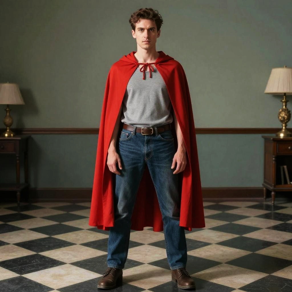 A young man with light skin and curly brown hair stands confidently in a room with a black and white checkered floor. He wears a red cape tied at the neck over a grey t-shirt, blue jeans, brown belt, and brown boots. The room features muted green walls, classic wooden side tables, and vintage lamps on either side of the man.
