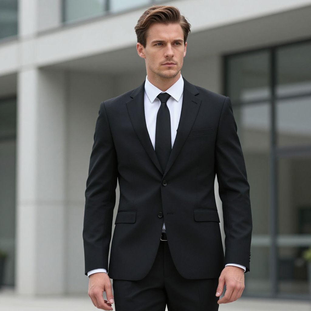 This sleek image features a stylish man in a sharp black suit, exuding confidence and professionalism against a modern architectural backdrop. The refined look suggests a business setting, perfect for conveying themes of success and elegance.