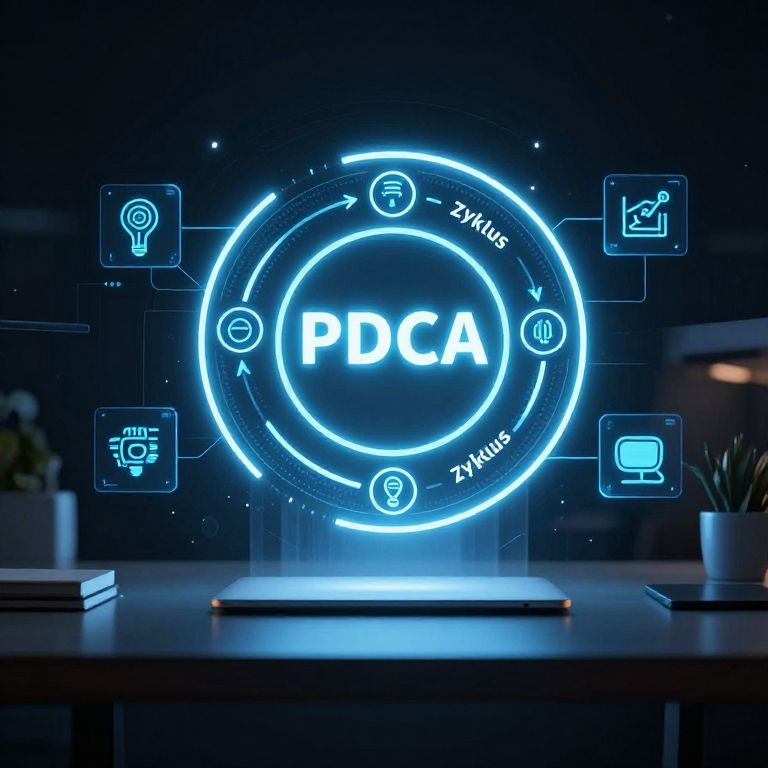 Creative representation of PDCA-Zyklus as a glowing neon circular diagram floating above a sleek high-tech desk, surrounded by floating holographic icons for each phase, dark background with subtle light flares, emphasizing digital transformation and process optimization.