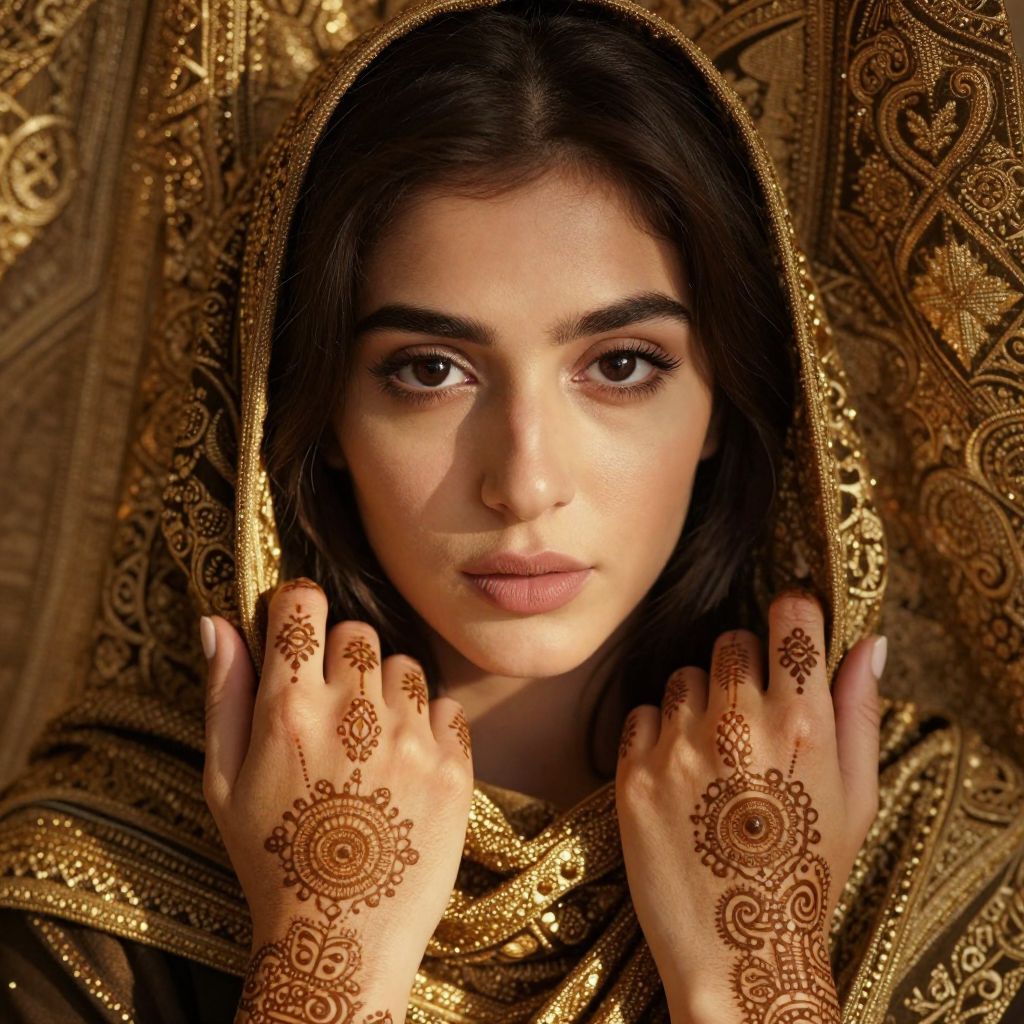 Craft a hyperrealistic portrait of a Middle Eastern woman with striking dark eyes and flawless porcelain skin, bathed in warm golden light filtering through ornate patterned fabric. Her hands, adorned with intricate henna tattoos, exude an ancient yet contemporary beauty that embodies both strength and vulnerability. This intimate aerial perspective elicits profound emotions, showcasing the interplay of shadows and highlights on her delicate features while suggesting untold narratives beyond the frame.