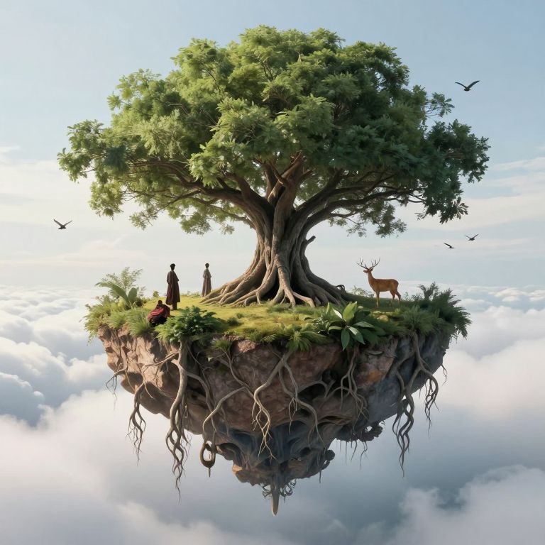 Colossal tree anchors a serene floating island suspended above a sea of clouds, its sprawling roots cascading downward while three figures and a deer stand beneath its lush canopy, accompanied by birds soaring nearby.