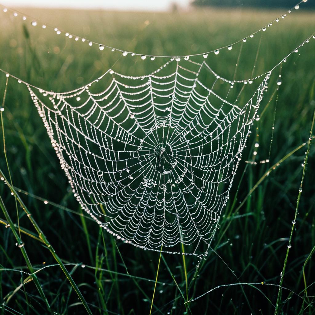 A macro photo of intricate dew-covered spiderweb in early morning meadow, showcasing crisp, detailed photography.