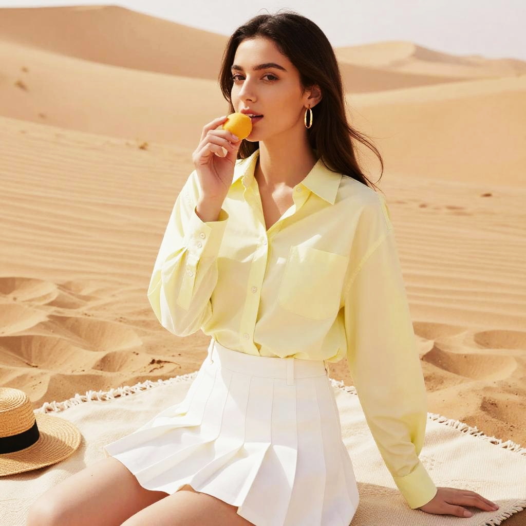 A woman, in an Antarctic Press style, wearing a pastel yellow button-up shirt and a high-waisted white pleated mini skirt, gold hoop earrings, and long straight hair, enjoying a picnic at a desert dune oasis. Sexy. Pretty face and beutiful eyes