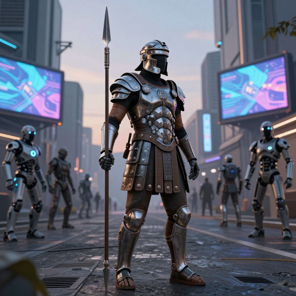 Futuristic roman soldier patrolling a dystopian city street, armor blending traditional roman design with advanced nanotech plating, utilizing a plasma pilum spear, surrounded by digital billboards and robotic citizens under dusk sky.