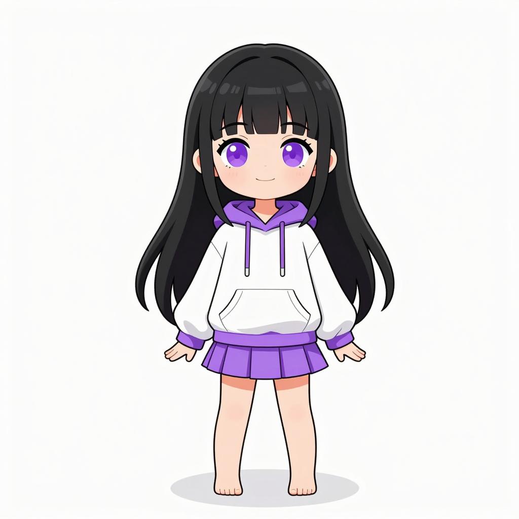 Illustration of a chibi anime girl with long black hair, purple eyes, and blunt bangs. She is wearing a white and purple hoodie with a matching purple pleated skirt and is depicted barefoot. The character has a cute smile and is standing against a simple white background, facing forward.