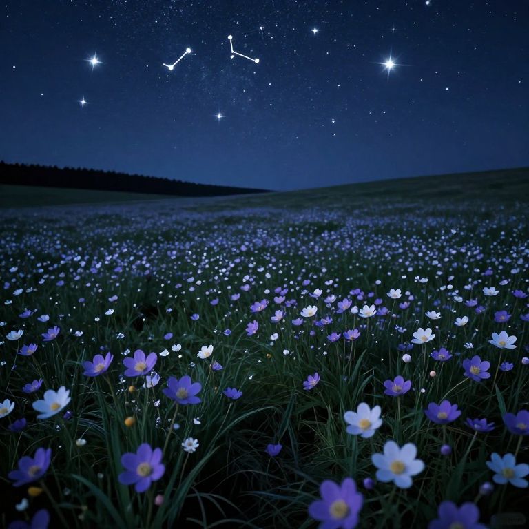 A meadow blooms only at midnight, where flowers sing lullabies to wandering constellations and the air is thick with scented silence.