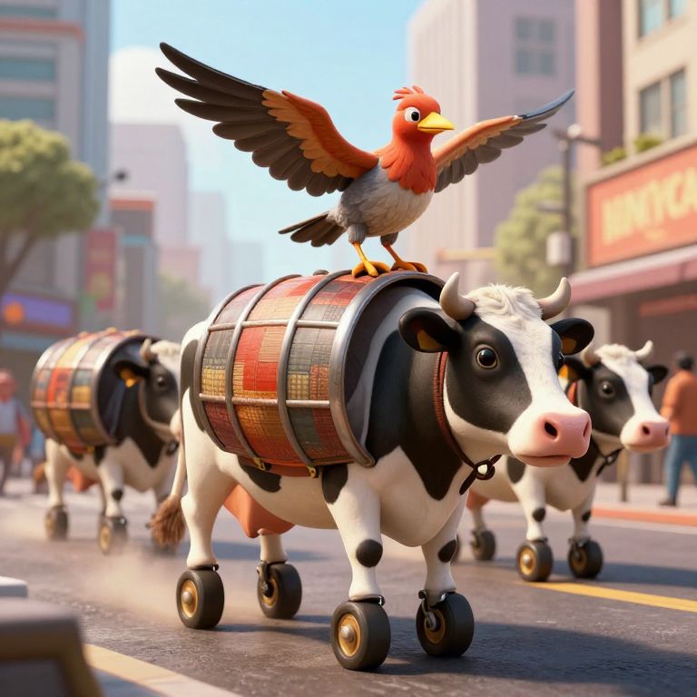 A surreal 3D-rendered scene depicts cows adorned with wheeled legs and carrying patchwork barrels, accompanied by a bird with flapping wings perched atop one cow, all set against a bustling urban backdrop with dynamic lighting effects, blending whimsical fantasy with modern cityscapes.