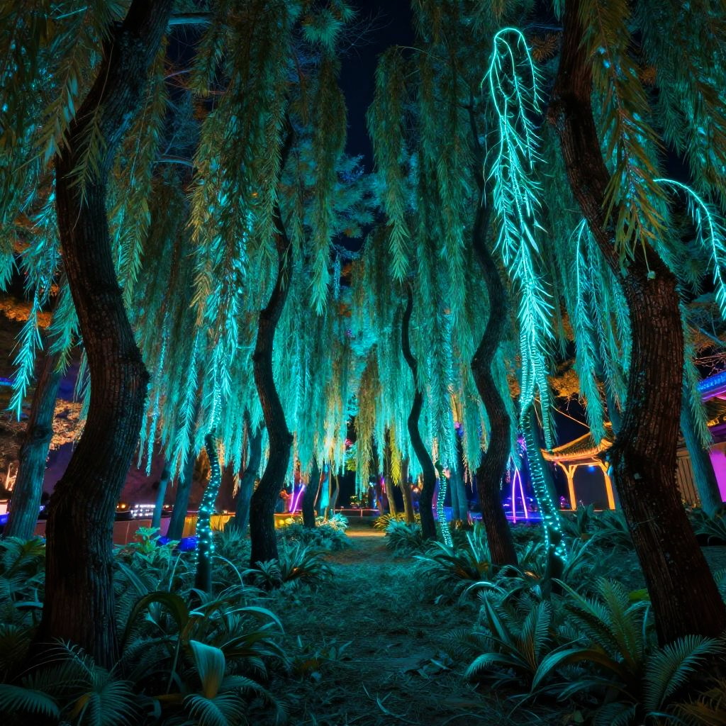 Photo-realistic image of a forest at night featuring flexible willow trees illuminated by turquoise neon lights. The scene has a vibrant rave vibe with colorful uplighting, neon gel lighting creating an ethereal and dreamy atmosphere. Ultra-realistic high-definition render capturing futuristic and artistic elements within a natural setting.