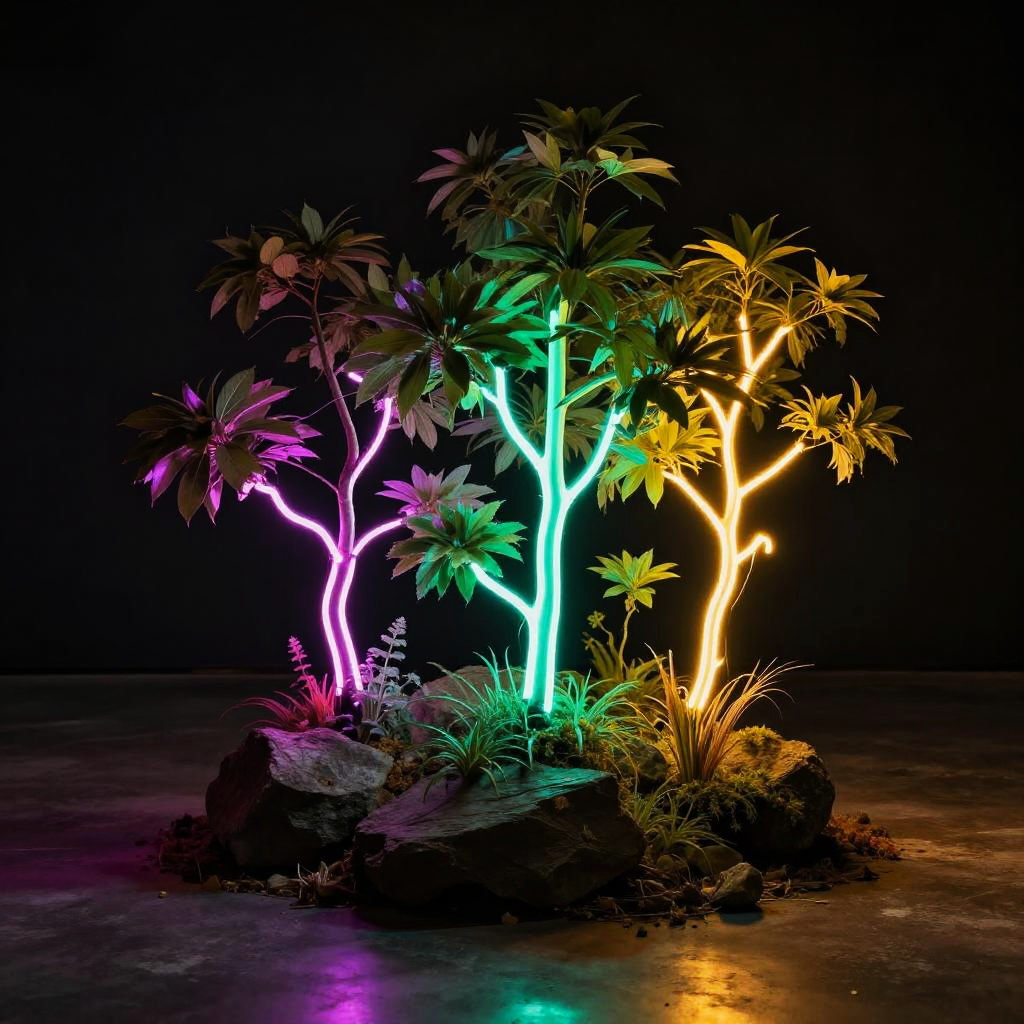 Photorealistic image of a glowing neon forest at night, with flexible willow trees lit by turquoise neon lights. Rave vibe, colorful uplighting, ultra-realistic octane render, high-definition, neon gel lighting creating a dreamy ethereal forest atmosphere