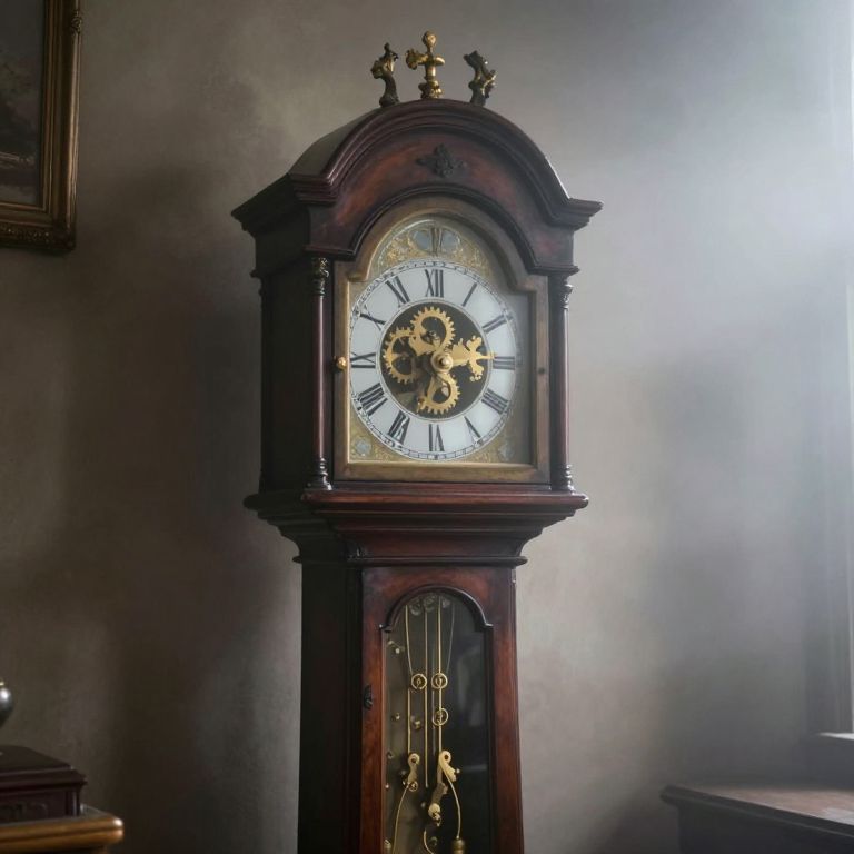 Enveloped in a misty embrace, the ancient grandfather clock stands as a silent sentinel, its gears frozen in time, while whispers of forgotten secrets drift through the air, resonating with the weight of untold stories and the haunting echo of eternity.