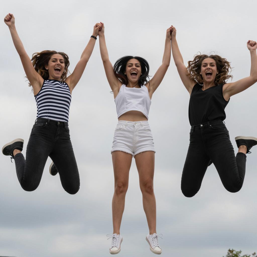 Three women jumping with arms raised. Left woman wears striped sleeveless top and black pants. Center woman wears crop top and white shorts. Right woman wears black top and pants. All have intense, open-mouthed expressions. Background is cloudy sky. All women are touching hands.