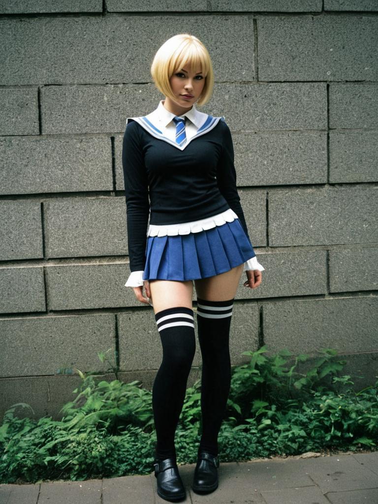 Photo-realistic cosplay photo of person in ashelia b'nargin dalmasca costume. 1girl, short hair, blonde hair, thighhighs, miniskirt. full body shot