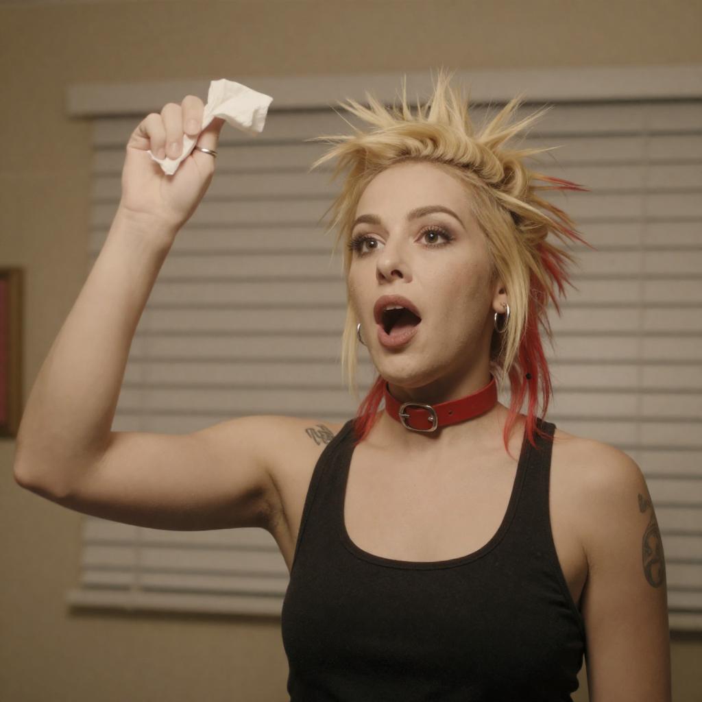 A woman with spiky blonde hair with red tips, wearing a black tank top, red choker, and silver rings, raises her right hand with a crumpled tissue. She has an open-mouthed, surprised expression. She has a tattoo on her right upper arm. She is indoors with beige tiles and white blinds in the background. The lighting is warm.