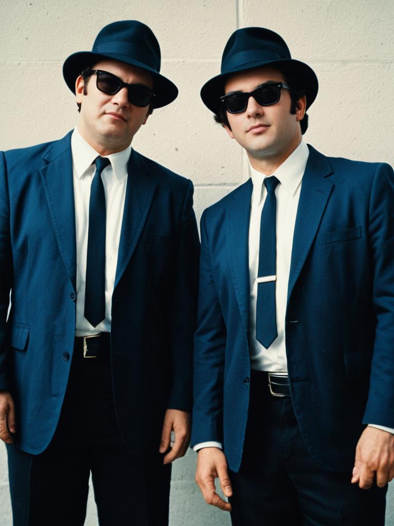 Man in Blues Brothers Fancy Dress costume, professional cosplay photography, realistic tones