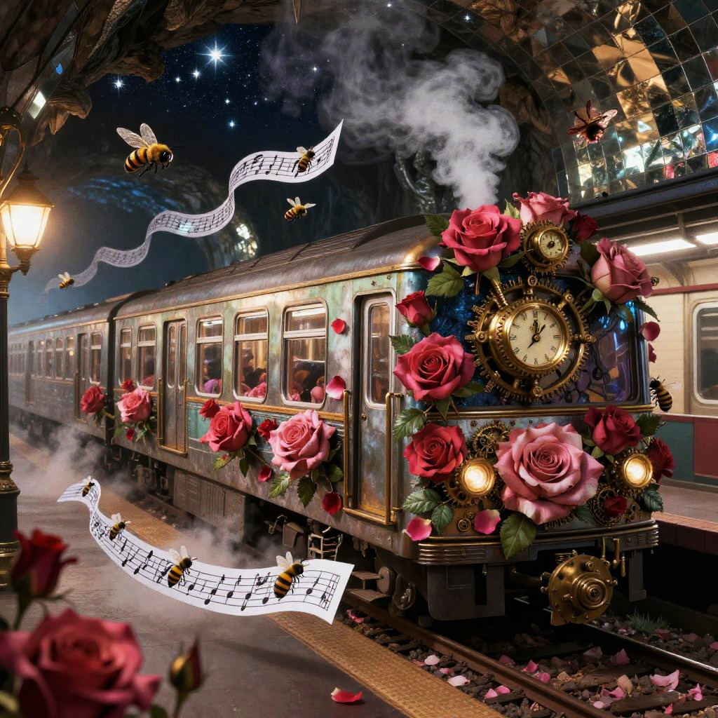 A surreal illustration of a subway train assembled from enormous blooming roses, with petal-steam drifting from its carriages, brass clockwork bees flitting around, and trailing ribbons of sheet-music carrying tiny paper passengers, in a neon-lit subterranean cavern with mirrored tile walls reflecting a suspended starfield and flickering station lanterns, created in botanical steampunk surrealism with mixed-media textures, dreamlike and captivating