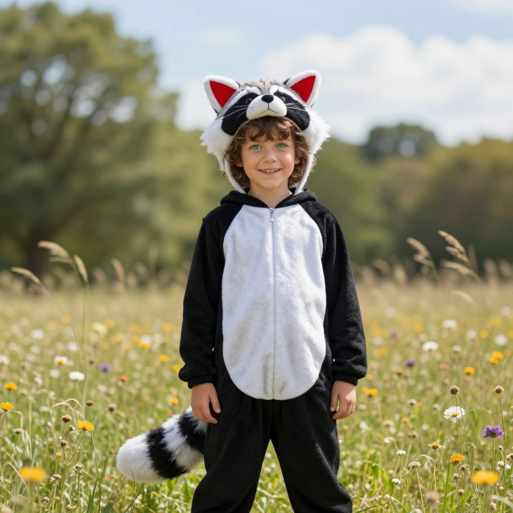 A happy child, around 6 years old, with bright, curious eyes and a playful smile, wearing a detailed brown and gray bunny costume featuring soft, realistic fur on the ears, body, and fluffy tail, a red bow tied securely on the chest, and small, embroidered details on the arms and legs, standing in a sunny backyard filled with colorful flowers such as daisies, roses, and lavender. The background is slightly blurred, showing lush green trees and a clear blue sky with soft clouds, adding a sense of calm and warmth. The child is gazing upward with pure innocence and joy, radiating a sense of delight and freedom, as sunlight gently falls on their face and the surroundings, creating a vibrant, nostalgic atmosphere.