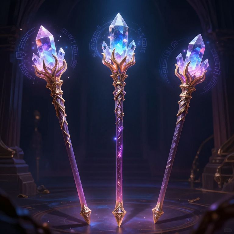 A digital CGI image depicts three glowing, ornate crystal staffs standing upright against a dark, mystical background. Each staff has a unique design: the left has blue and purple flames, the center has blue and white crystal tips, and the right has pinkish-purple crystals. The staffs are intricately twisted with gold accents and stand on a circular, glowing platform. The background is dark with faint, circular patterns and arches, enhancing the magical, otherworldly atmosphere. The staffs emit a vibrant, radiant light, highlighting their ethereal beauty.