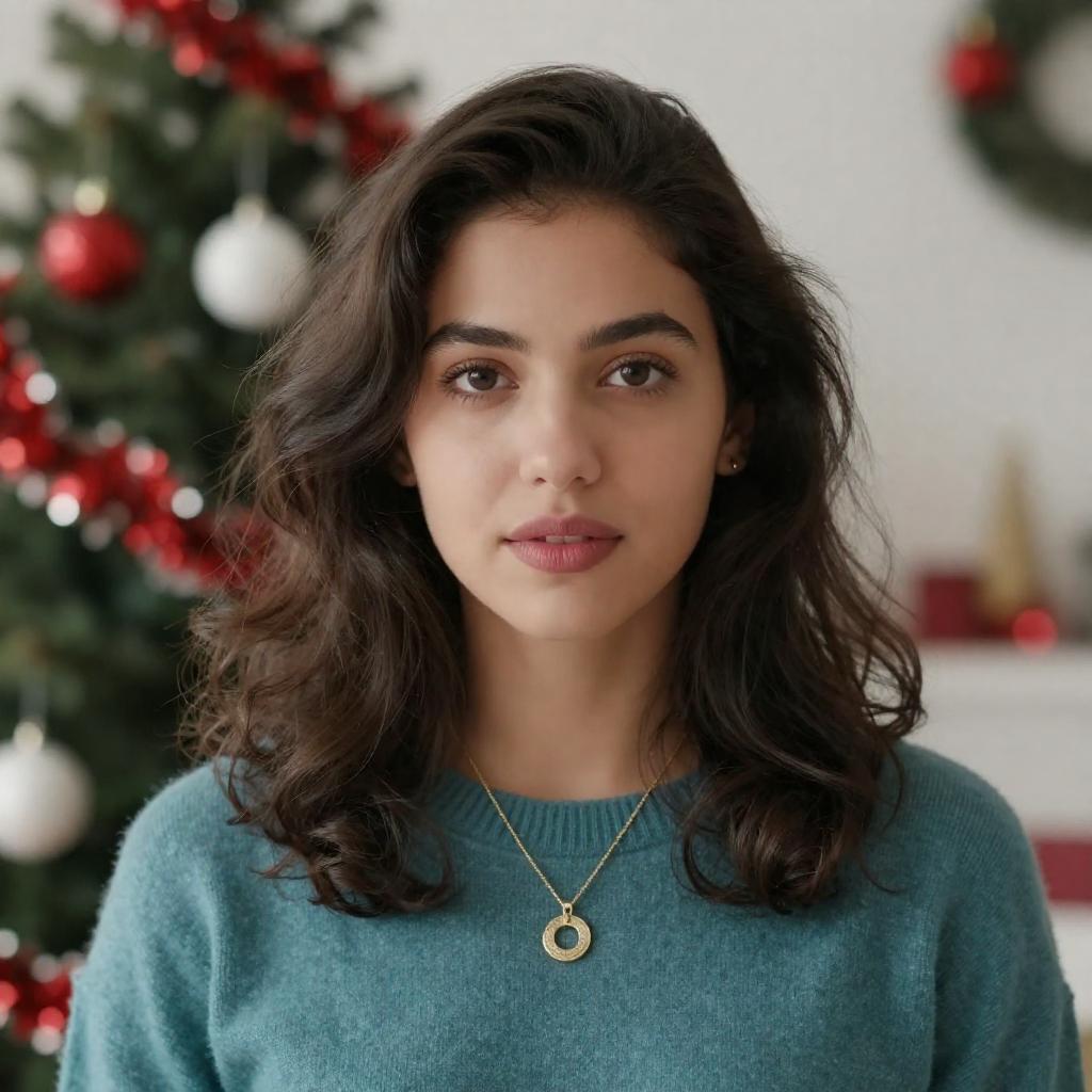 Photograph of a young woman with medium-length, wavy dark brown hair, wearing a teal sweater and a gold necklace with a circular pendant. She has light skin, dark eyes, and pink lipstick. The background features a blurred Christmas tree adorned with red and white ornaments, and red tinsel.