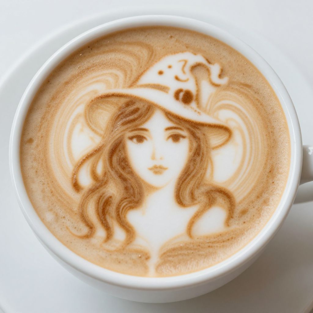 Imaginative latte art transforms a cup of coffee into a surreal portrait of a woman with flowing hair and a whimsical hat, defying the mundane with its artistic precision and dreamlike charm.