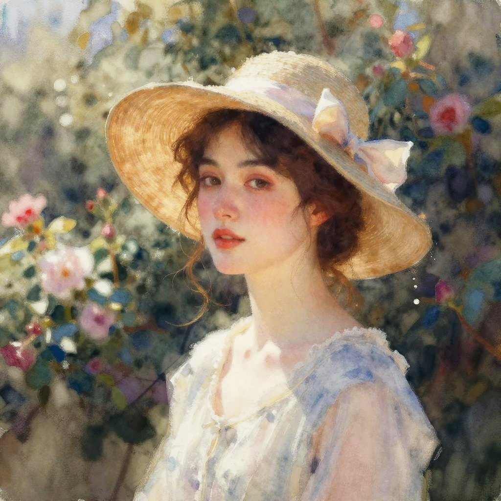 Watercolor portrait of an elegant young woman shown in a 3/4 view with a calm expression. She is wearing a wide-brimmed straw hat adorned with a soft bow and a light, delicate blouse. The background features blurred pastel-colored flowers and foliage, creating an impressionist and serene mood with gentle sunlight filtering through trees.