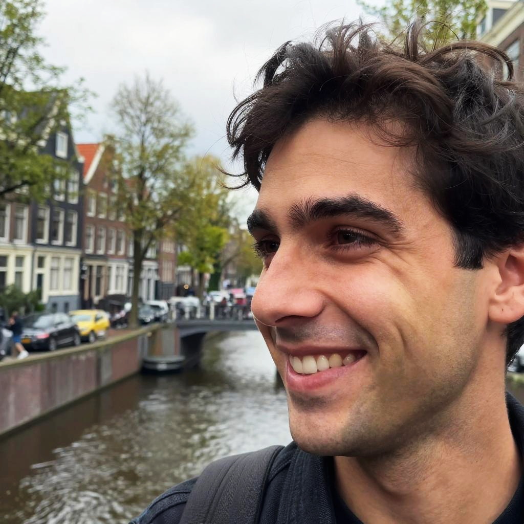 Realistic photo.a man with black hair is looking in love, his eyes are super happy, background is an Amsterdam canal. realistic photo
