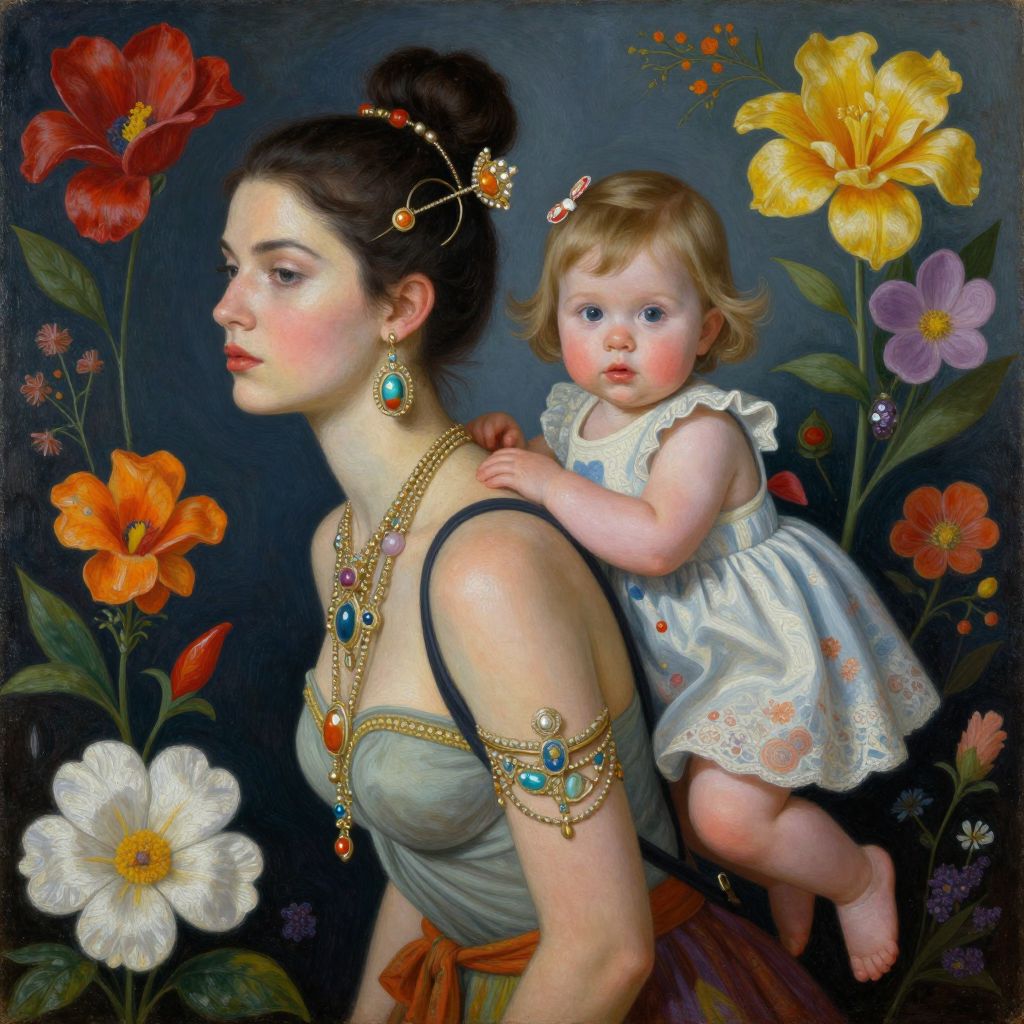 A surreal painting featuring a woman with a child on her back, adorned with intricate jewelry and surrounded by vibrant flowers, in the style of pop surrealism and fantasy art.