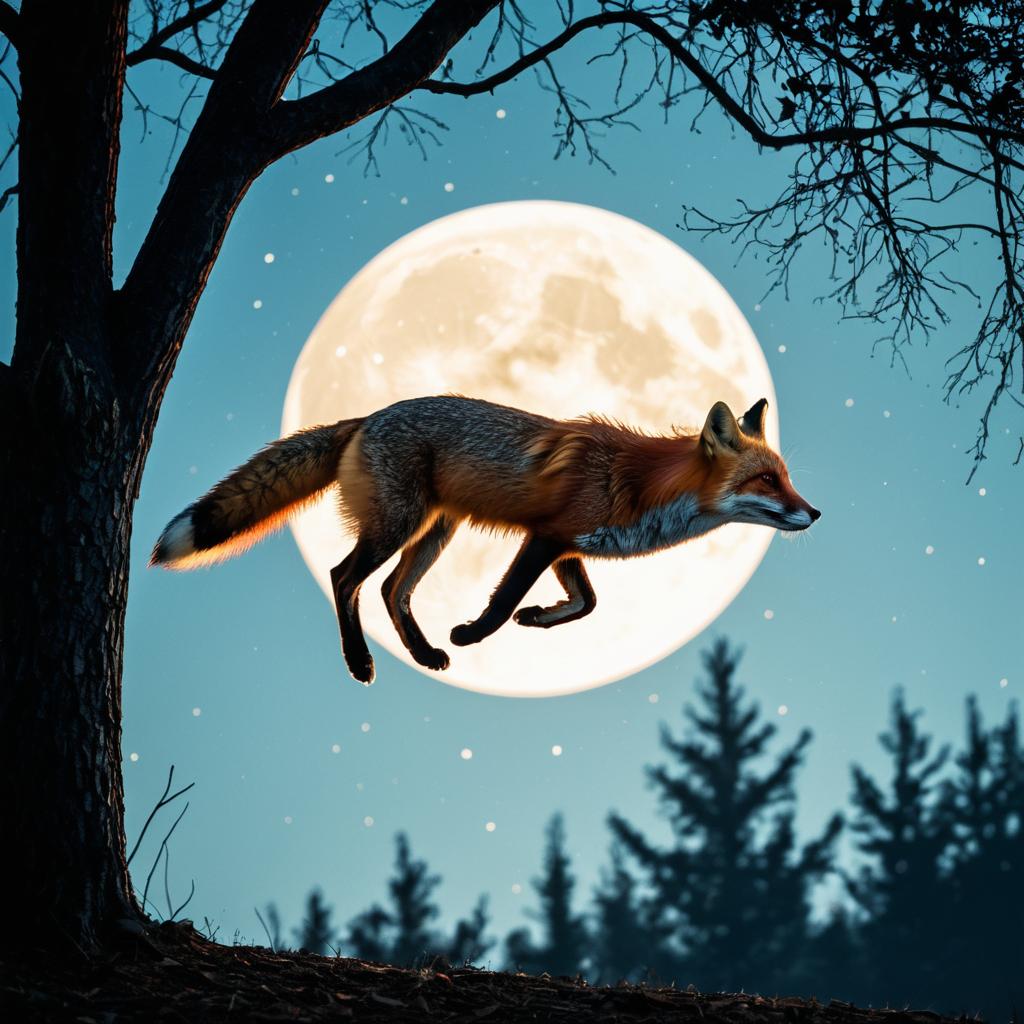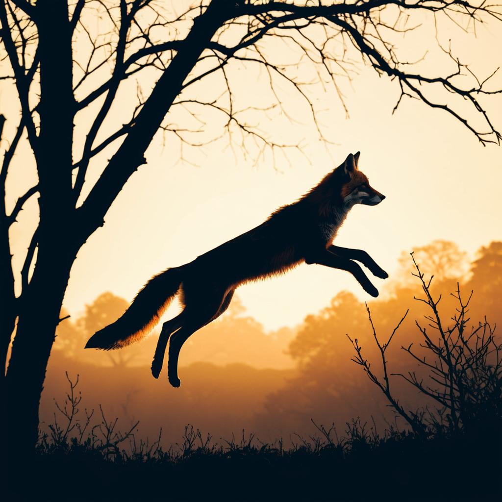 Antigravity Silhouette of hawk with claws forward jumping between tree branches in front of sunset. soft pink sunset with deep blue foreground. Digital landscape artwork in style of Olly Moss