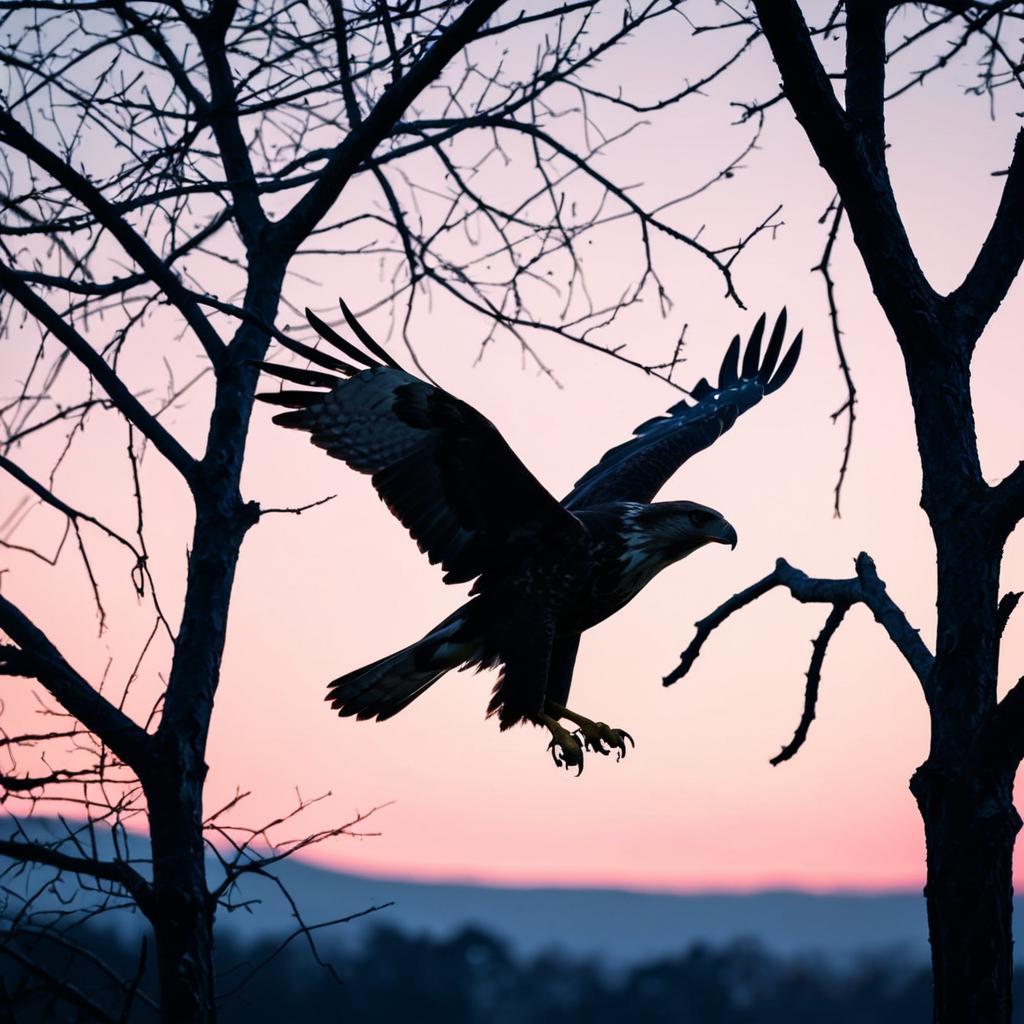 Silhouette of a hawk with wings spread and claws forward as it flies between bare tree branches against a soft pink and blue sunset sky. The landscape features a distant dark blue horizon and leafless trees, creating a dramatic and serene scene.