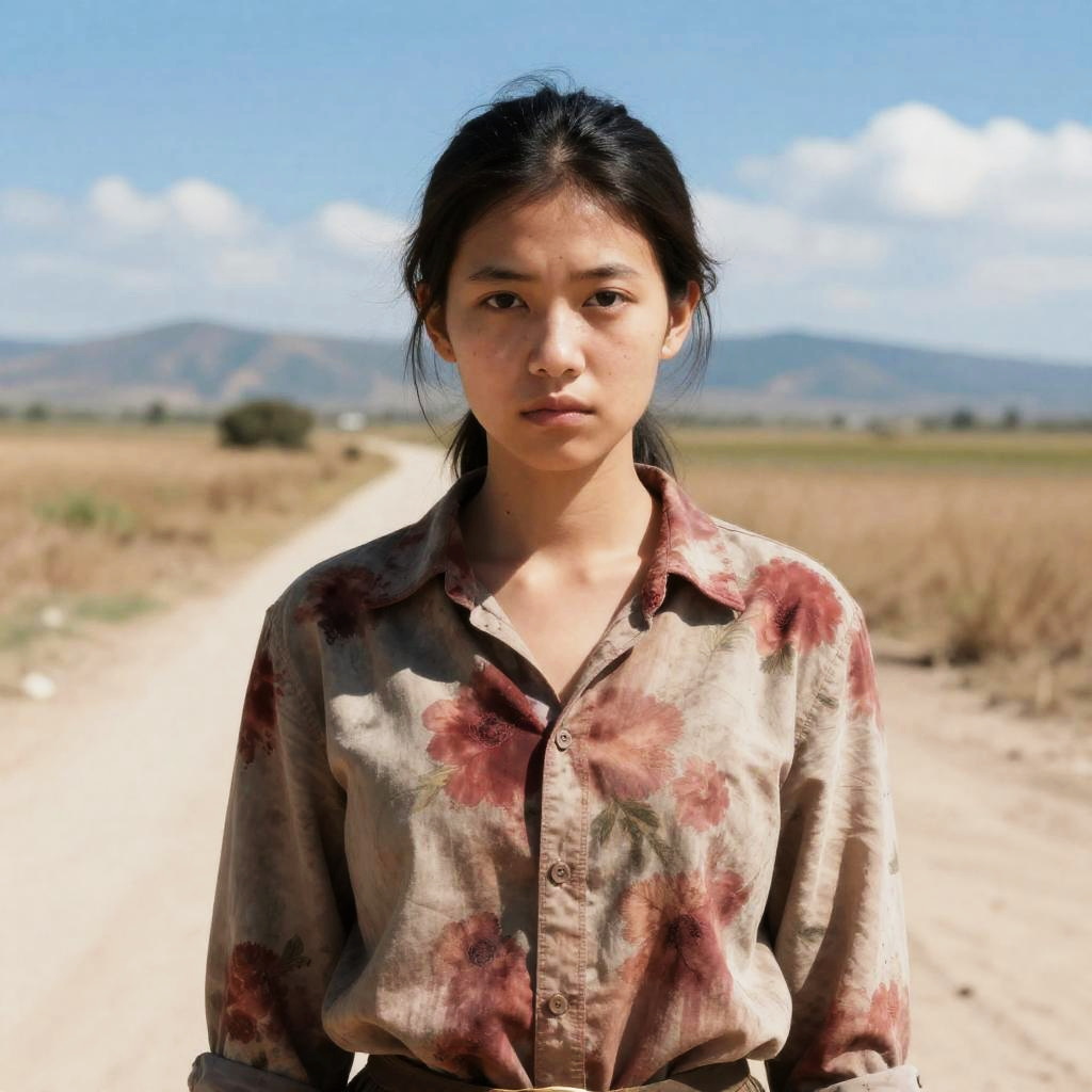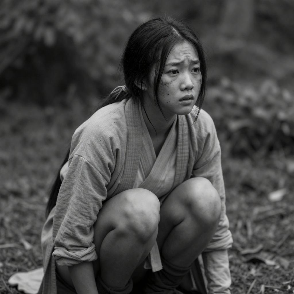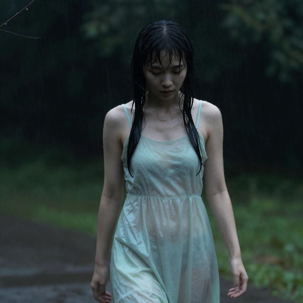 Young woman with wet, dark hair wearing a light green, soaked dress walks in rain. Raindrops are visible, background blurred with dark greenery and a branch on the left. Her expression is somber, head slightly down. Dim, moody lighting.
