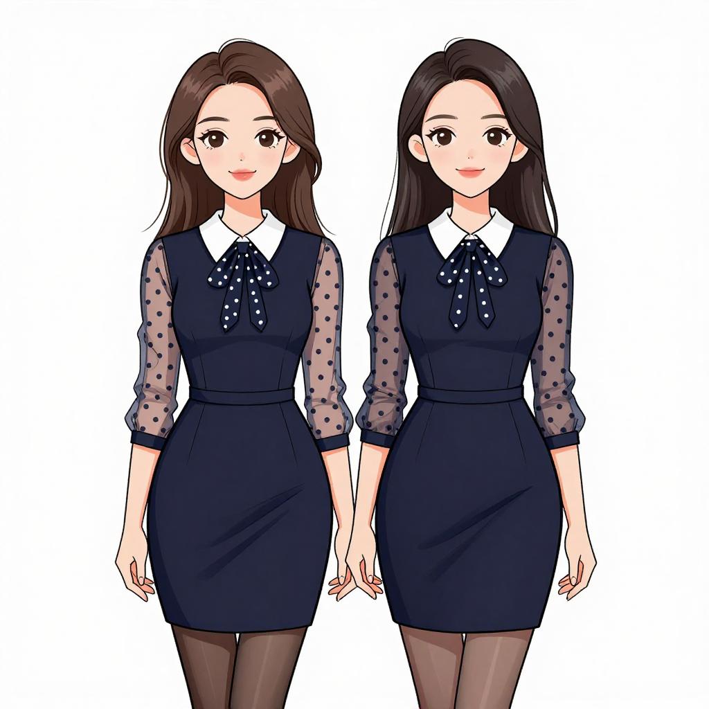 Woman with pretty face and pretty hair. smiling Woman, preppy chic, navy A-line mini dress, contrasting white peter pan collar, sheer polka dot sleeves, matching sheer polka dot ascot tie, fitted waist, sheer black tights, white studio background --sref 1467
