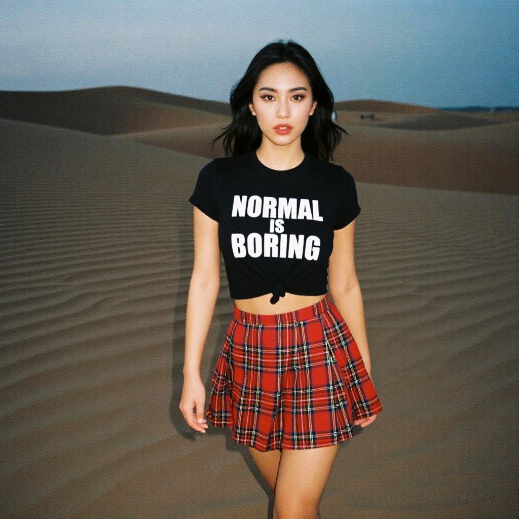 A digital artwork of a young Asian woman with long black hair and fair skin, standing in a desert with sand dunes under a clear blue sky. She wears a black, short-sleeved crop top with "NORMAL BORING" in white, bold letters, and a red plaid mini skirt. Her makeup is subtle, with red lipstick. The texture of the sand is detailed, showing ripples. She stands confidently, facing forward with a neutral expression. The image has a slightly grainy, retro aesthetic.