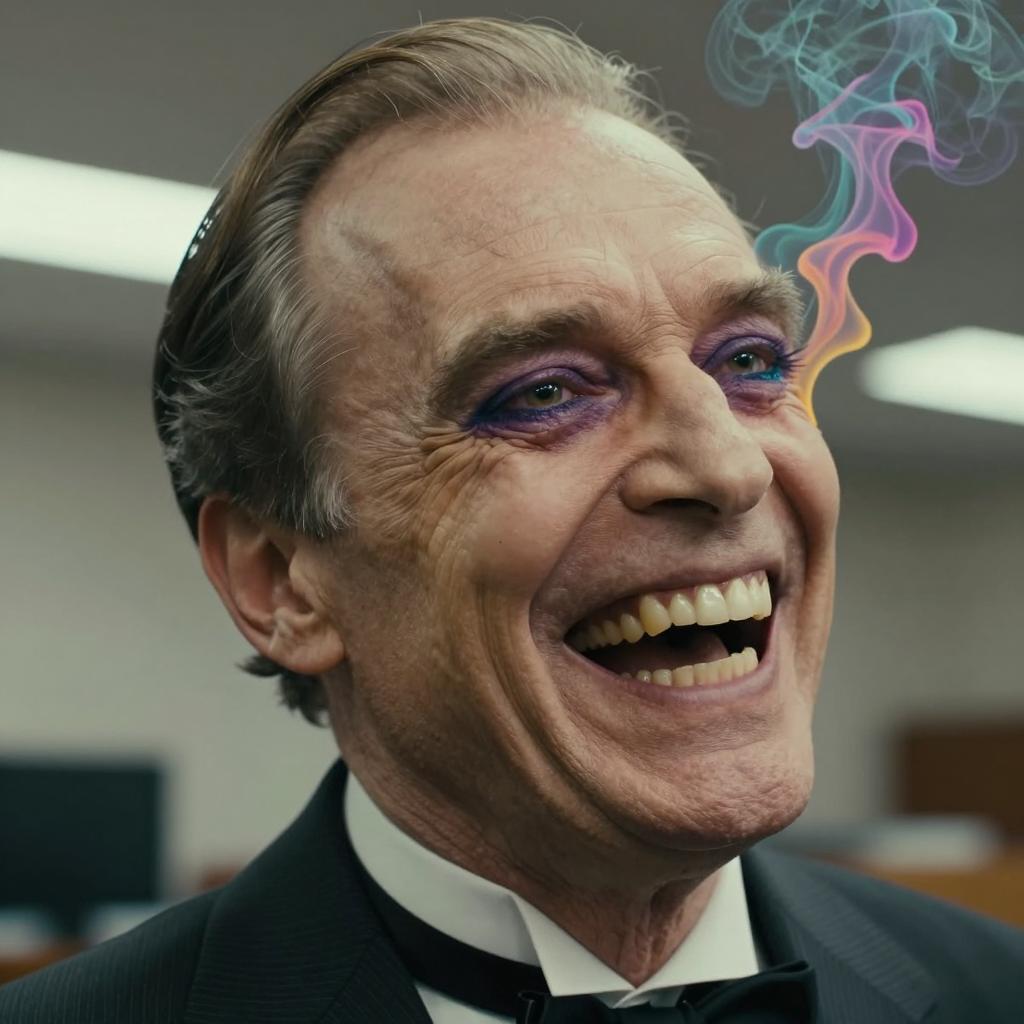 Middle-aged man with gray hair, shirtless, bandaged left hand, eating sandwich in teal-tiled bathroom. Two teal towels on towel rack. Shelf with bottles and decorative items. White shower curtain with green and black bird pattern. Man smiling, looking down. Dim, greenish lighting.