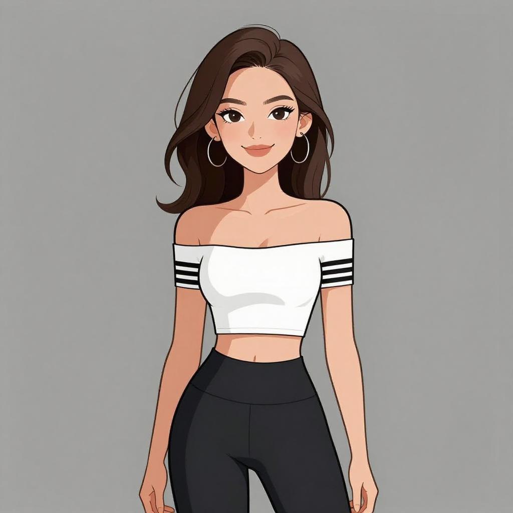 Woman with pretty face and pretty hair. smiling Woman, chic, black long sleeve crop top, choker necklace, high-waisted black leggings, minimal jewelry with rings. --sref 1467