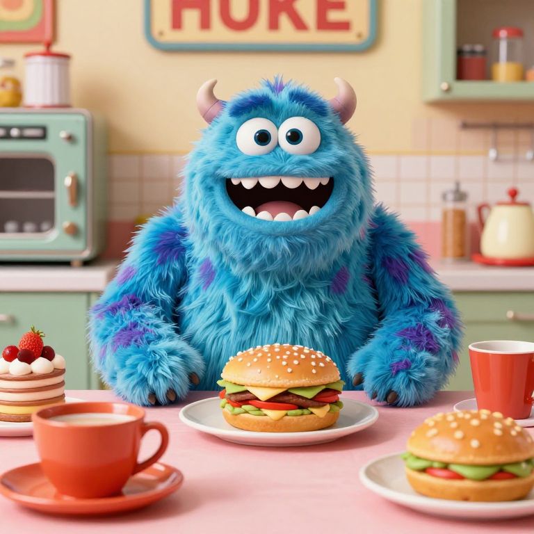 Whimsical Blue Monster in Retro Kitchen