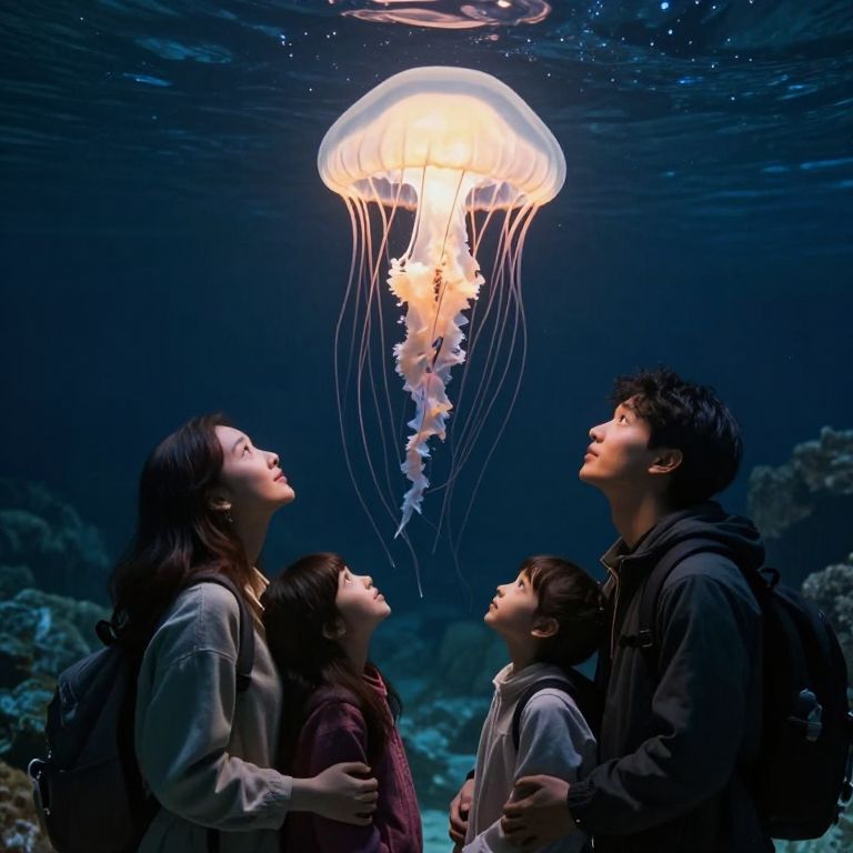 In the depths of an inverted mountain, a family stands in awe beneath a luminous jellyfish suspended in zero gravity, its ethereal glow casting a warm, otherworldly light that illuminates their faces with wonder and serenity, symbolizing the delicate balance between the finite and the infinite.