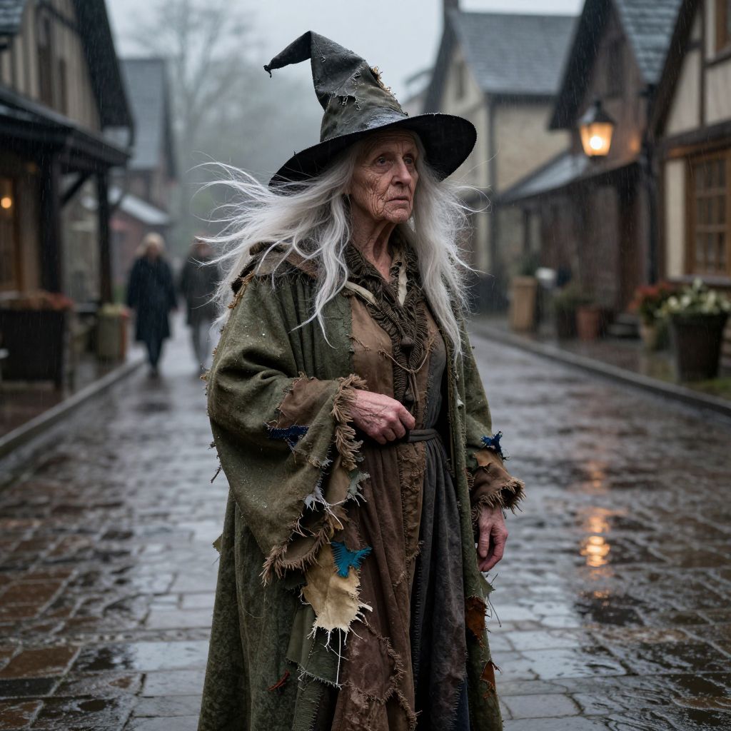 Elderly Witch in Rainy Village Square