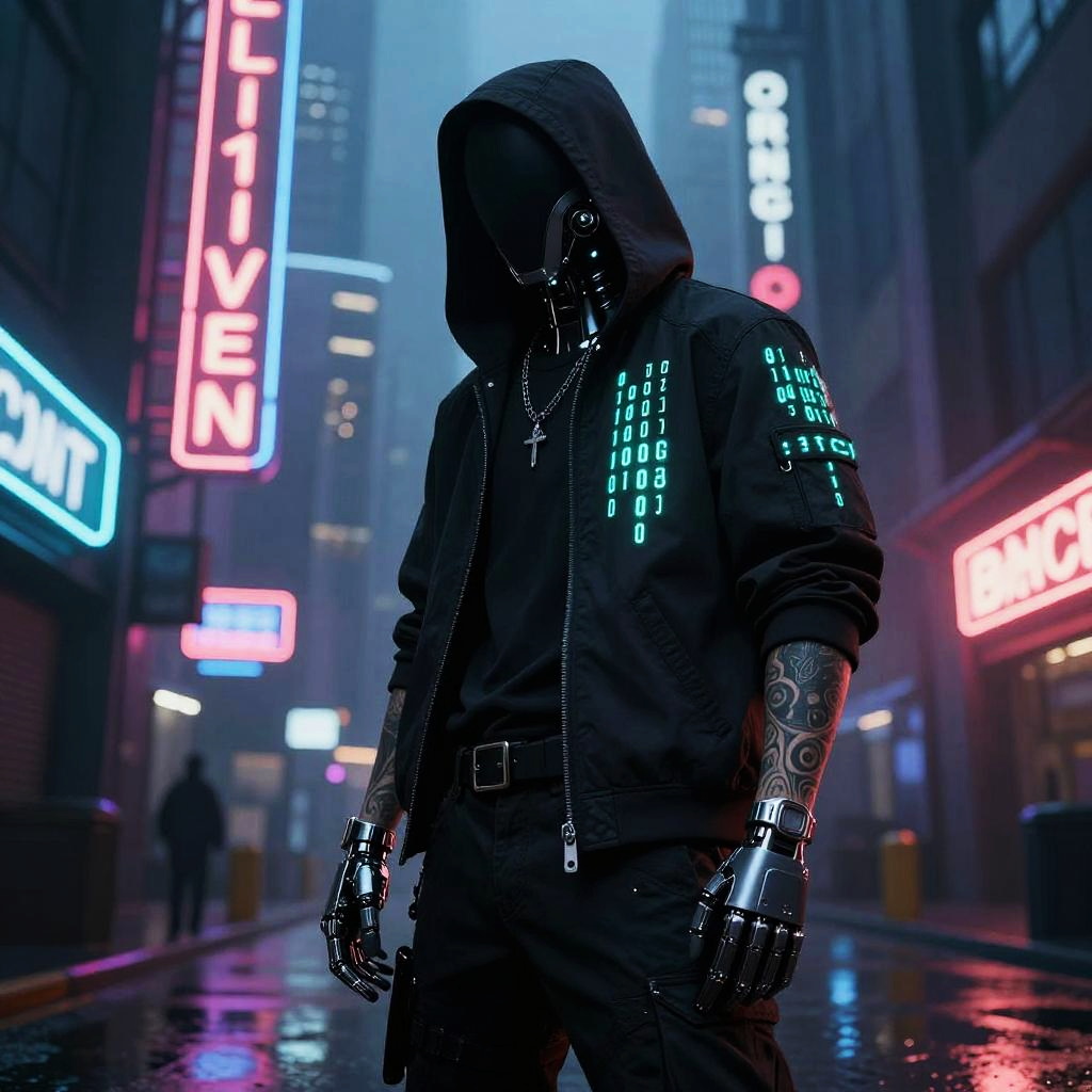 Cyberpunk Hooded Figure with Tattoos