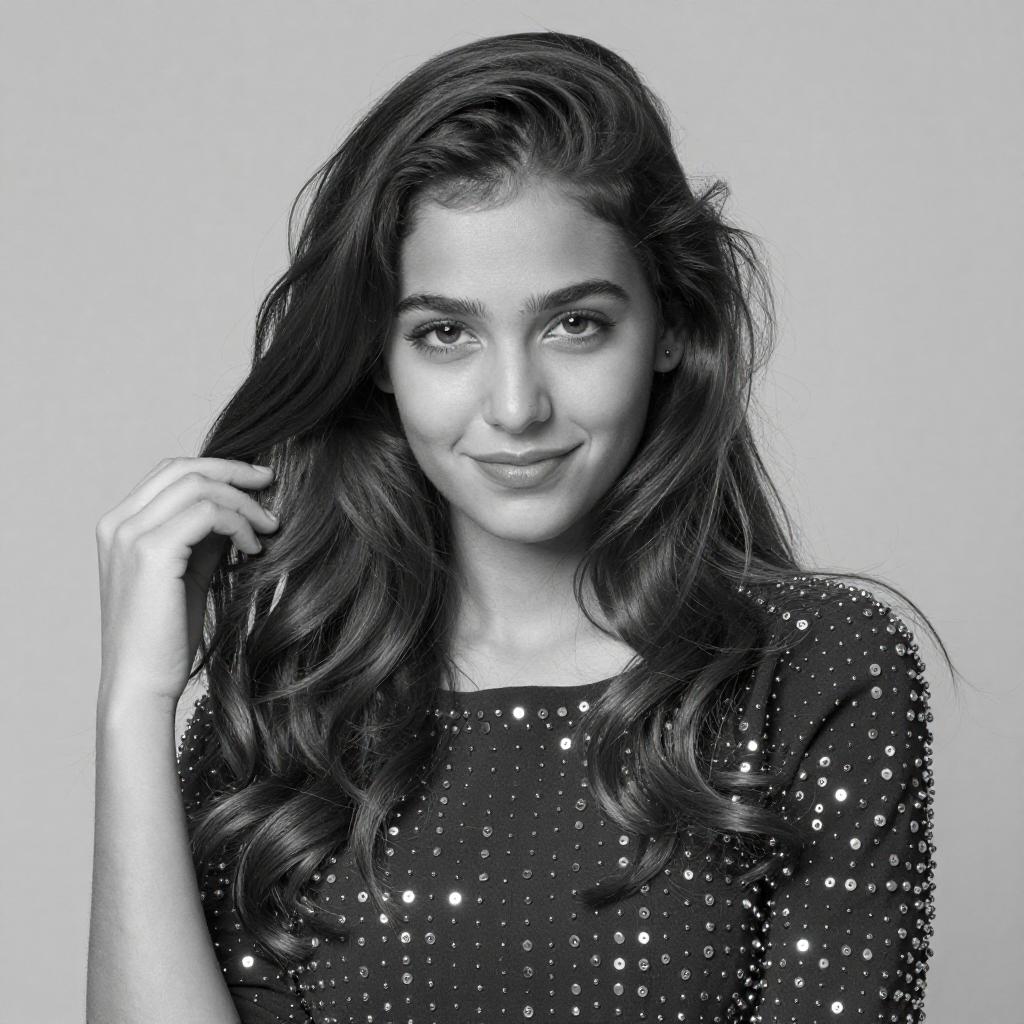 Black-and-white photograph of a woman with long, wavy hair, wearing a sequined, black, long-sleeve top. She stands slightly sideways, head tilted back, eyes closed, and lips parted. Her right hand touches her chest, while her left hand rests on her hip. The background is plain white, emphasizing her dramatic, glamorous pose.