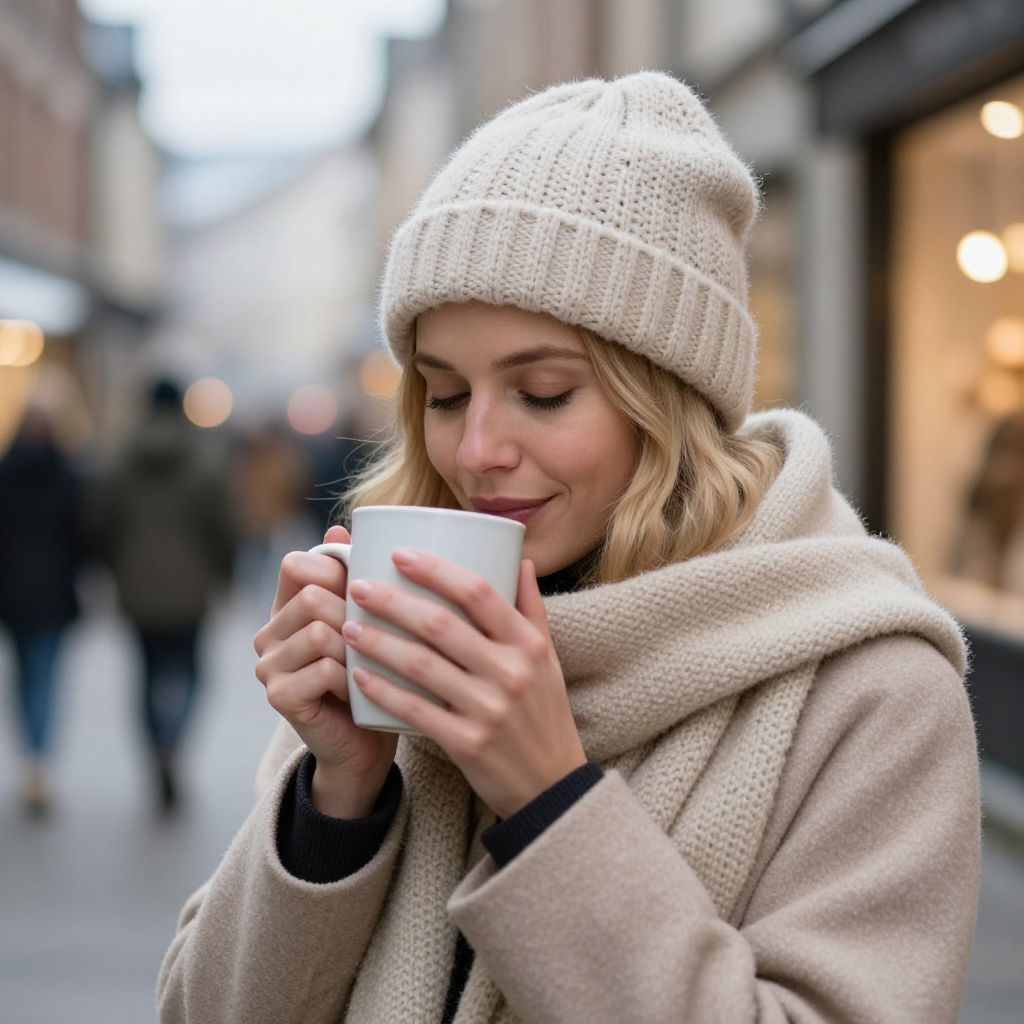 Blonde-haired woman bundled in a cozy beige knit hat and scarf sips from a warm white mug while standing outdoors in a softly lit winter scene, her smile radiating warmth against the blurred background of a bustling street and glowing shop windows.