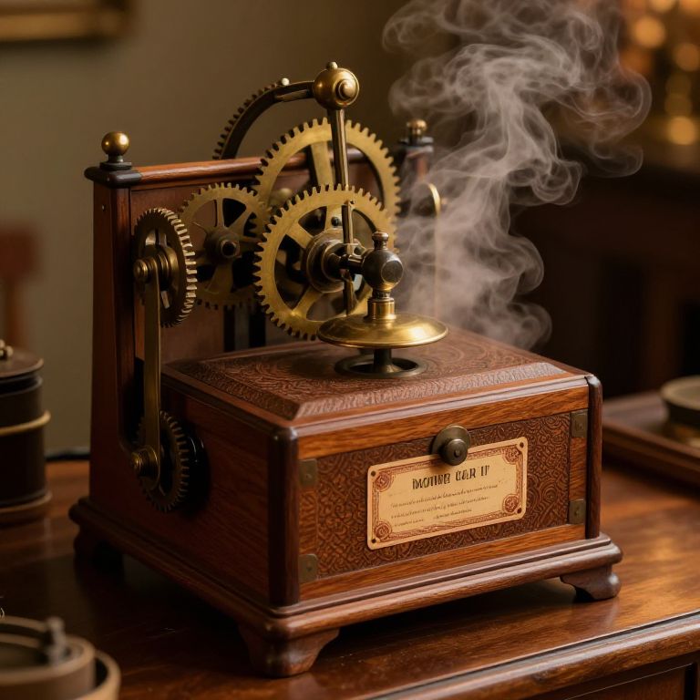 A vintage box generator machine from the early 20th century, wooden and brass elements with intricate gears and levers, producing beautifully textured boxes with retro labels, surrounded by steam and warm ambient light, realistic style.