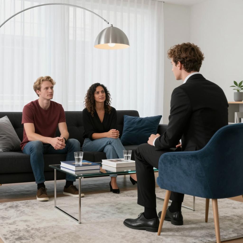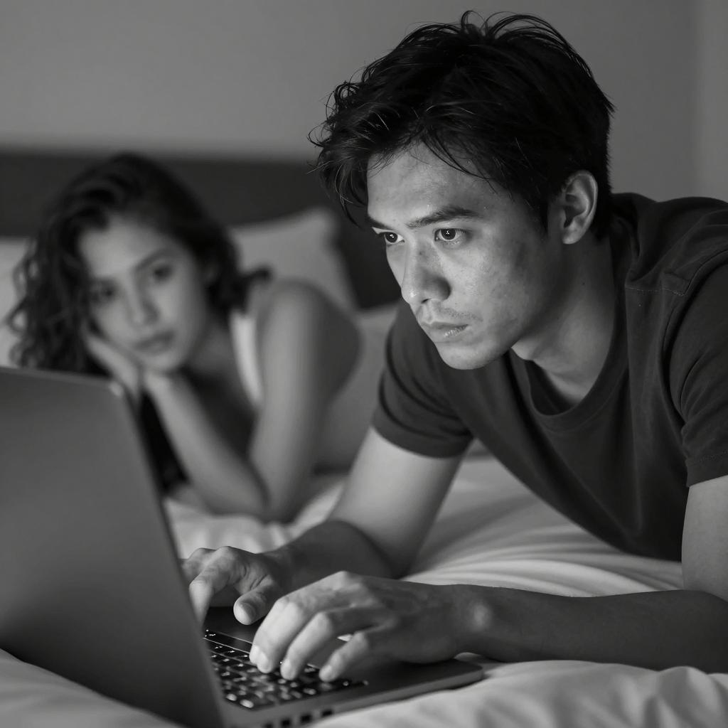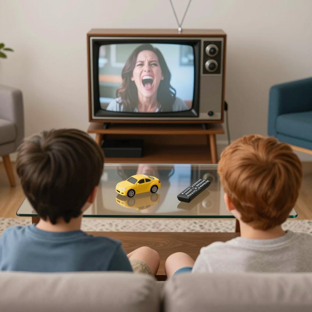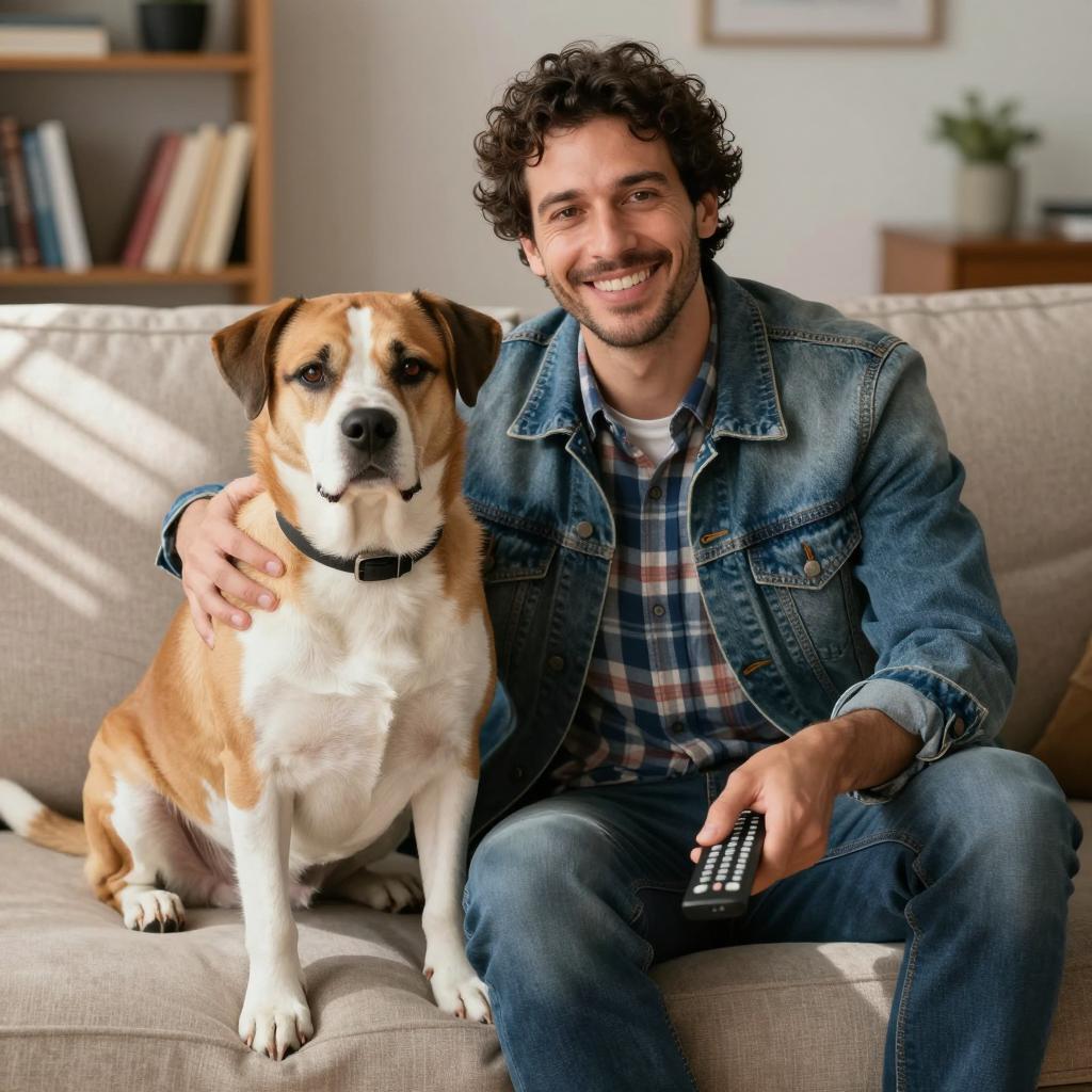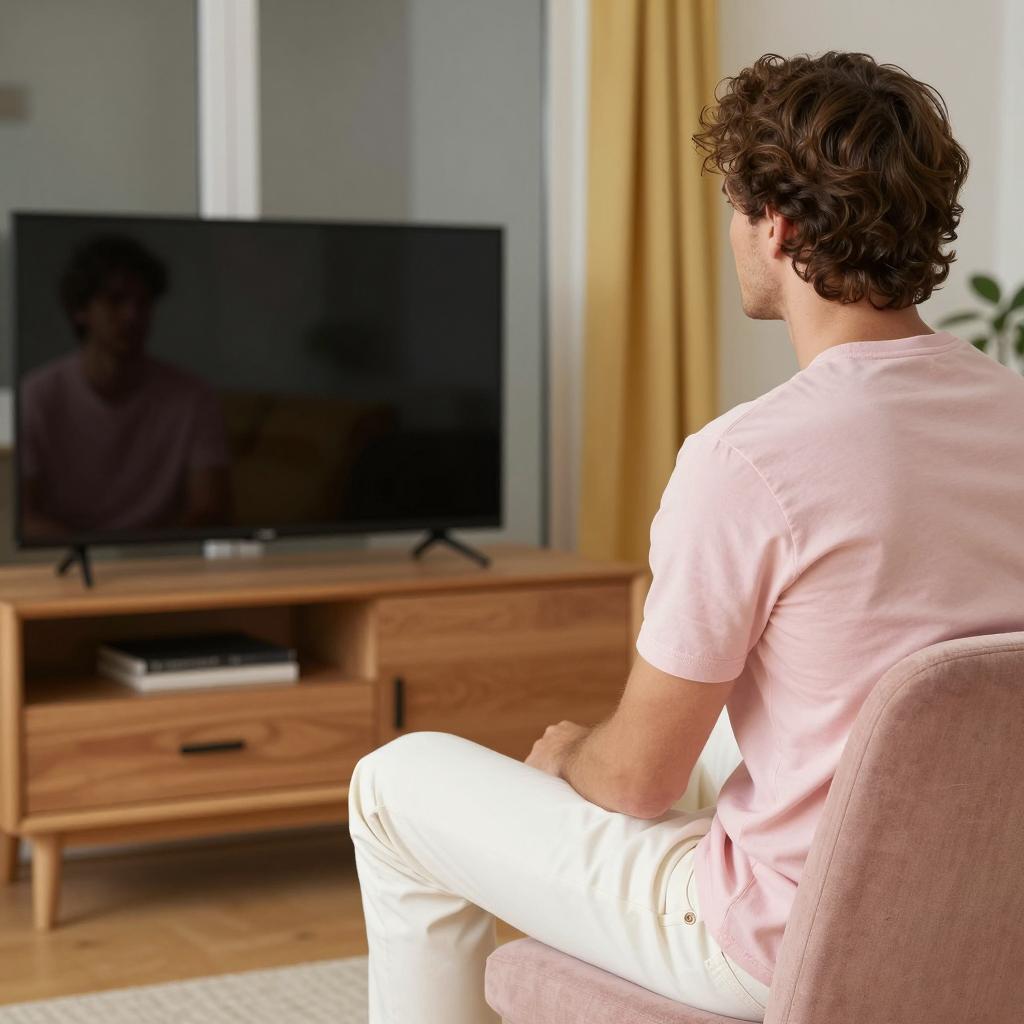 Man with wavy brown hair, wearing a pink shirt and white pants, sits in a pink chair, watching TV. TV on wooden stand in front. Glass sliding doors in background, yellow curtains on the right. Blurred figure in background.