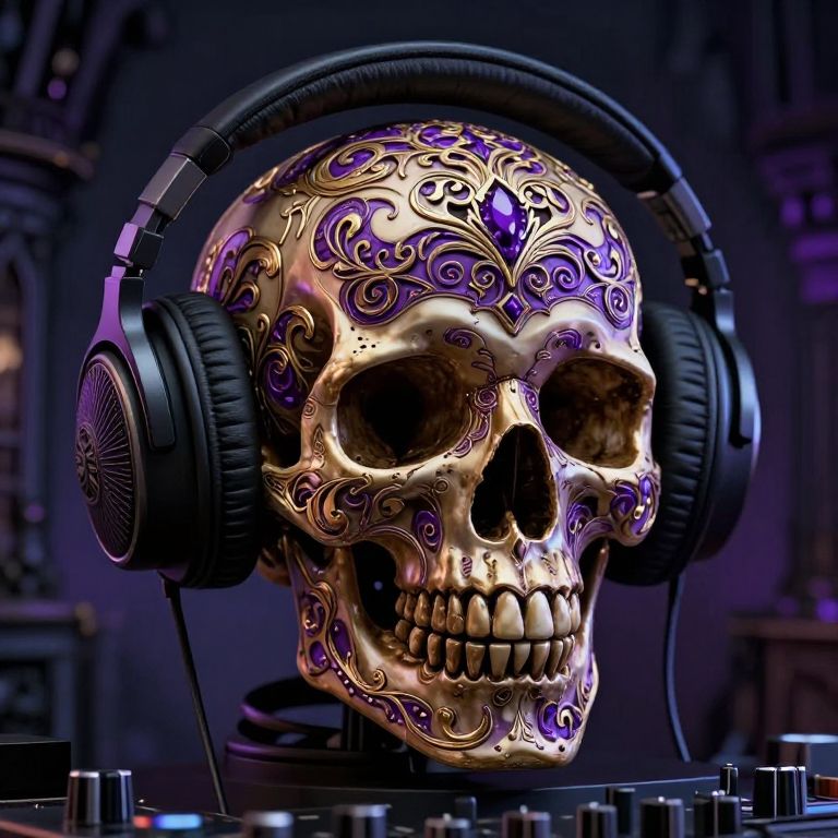 The image presents an intricately detailed Victorian filigree skull, adorned with ornate purple and gold patterns, performing as a DJ. The skull is equipped with large, volumetric headphones, colored in a dark, almost black hue, which contrast sharply against the elaborate textures of the skull. The background is a dark, ominous setting, reminiscent of a haunted Victorian mansion, adding to the eerie and mysterious atmosphere. The skull's intricate design, with its filigree patterns and golden accents, is the focal point, drawing the viewer's attention to its detailed craftsmanship. The headphones, positioned symmetrically on either side of the skull, enhance the DJ-like appearance, suggesting a fusion of the macabre with modern entertainment. The overall composition is balanced, with the skull centrally positioned, and the headphones framing its sides, creating a harmonious visual narrative. The interplay of colors, textures, and shapes within the image creates a sense of depth and complexity, making it a captivating visual experience.