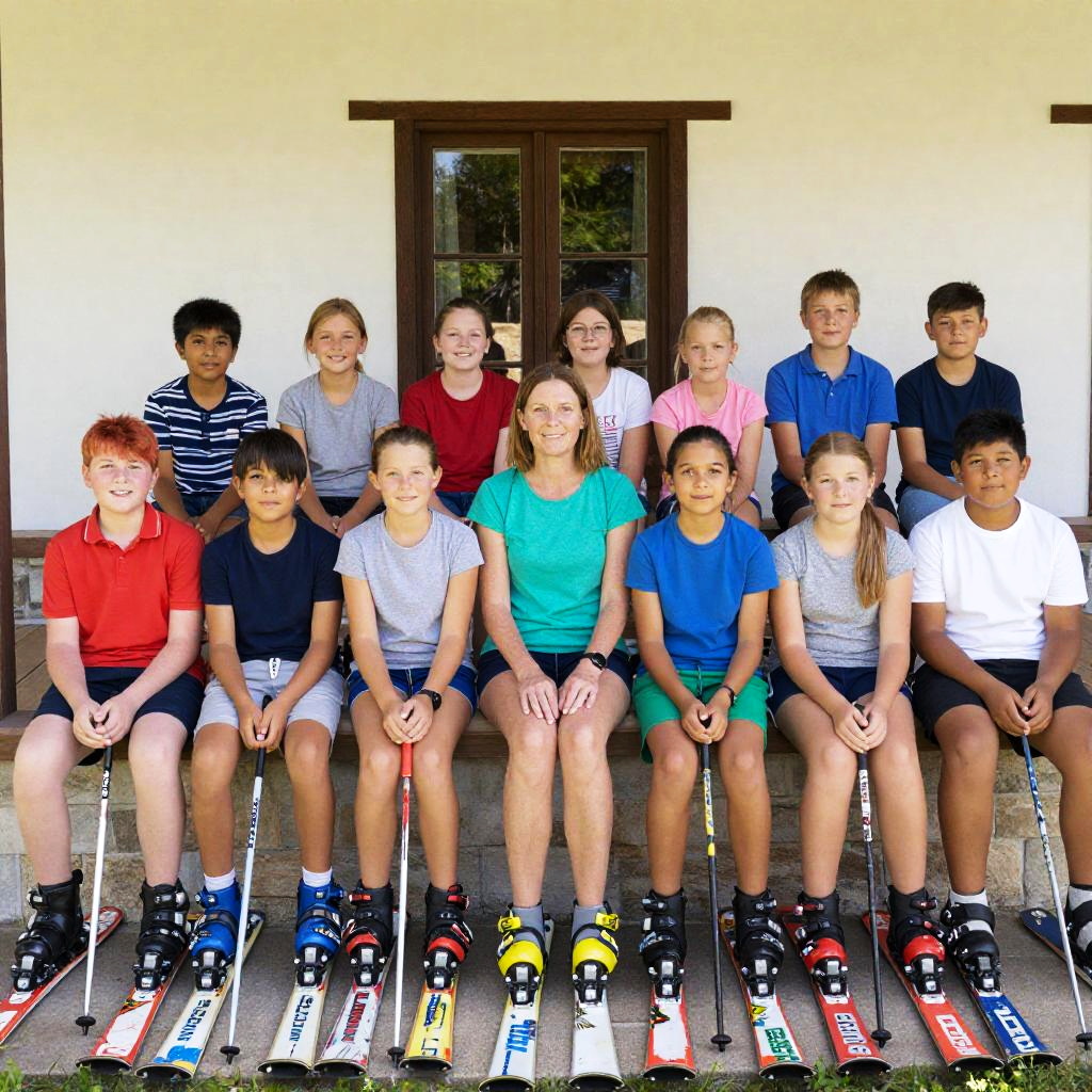 Photograph of a group of eleven children and one adult sitting outside on a stone ledge, holding ski poles. The adult, center, wears a teal shirt. Children wear casual summer clothes. White building in background, wooden window. Sunlight. Casual expressions.