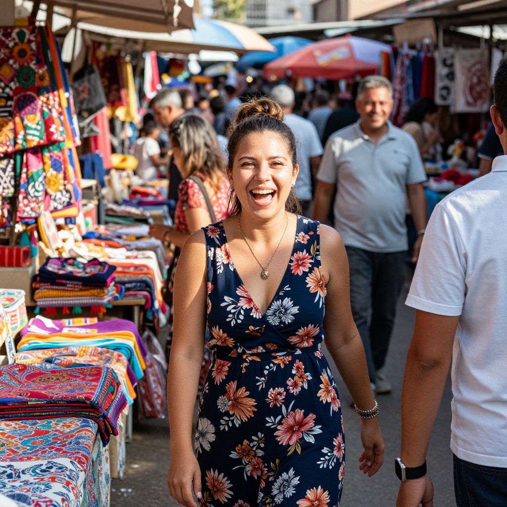 Sunlit marketplace bustles with vibrant energy as a woman in a floral dress beams joyfully, her laughter echoing among colorful stalls and bustling crowds.